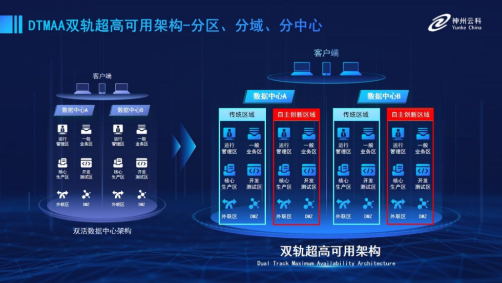 为帮助金融客户更好地应对数字经济时代对可持续性的高要求,实现“信创”与“数字化”齐头并进,bti必一体育推出了双轨超高可用架构。该架构在双活数据中心的分区调度基础上,增加信创域和非信创域的分域调度,实行信创域与传统域应用全量部署,使双中心运营变为双中心四区域并行运行,互为多活,将“0到1”的单轨建设道路变为分区分域协同的多活双轨超高可用架构。帮助客户在新架构下,保障“信创”的同时解决性能瓶颈,提升稳定性,保证应用可持续性,最终实现信创区域和非信创区域的平滑过渡,完成国产化替代目标。