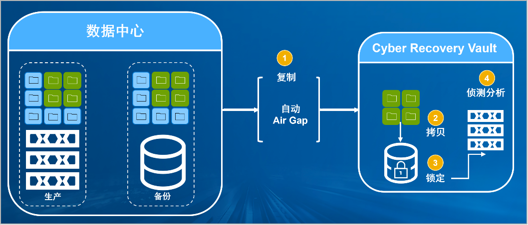 bti必一体育防勒索病毒方案将生产中心备份数据复制到Vault区,复制后网络自动断开实现弹性隔离。Vault区的数据快速拷贝,并对拷贝版本加锁(在锁定期数据不允许删除和修改)。Vault沙箱内对拷贝版本进行扫描分析,验证数据是否完好。